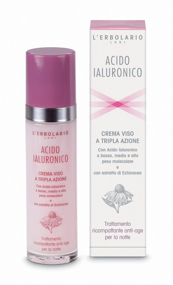 ErbolarioAll’ampia gamma Acido Ialuronico de L’Erbolario appartiene un trattamento ricompattante anti-age per la notte, Crema Viso a Tripla Azione che si avvale dell’azione dei tre differenti pesi molecolari, basso, medio e alto, dell’acido ialuronico. Questa crema da applicare preferibilmente la sera, dal momento che durante la notte soprattutto la pelle si rigenera, contiene appunto, come ingrediente principale, l’acido ialuronico che agisce a diversi livelli dell’epidermide. Ad alto peso molecolare non penetra attraverso l’epidermide ed esercita un’azione idratante esclusivamente di superficie. Applicato sulla cute, forma un film protettivo invisibile e non occlusivo, permettendo così alla pelle di respirare, riducendo i fenomeni evaporativi e limitando quindi la perdita di idratazione.