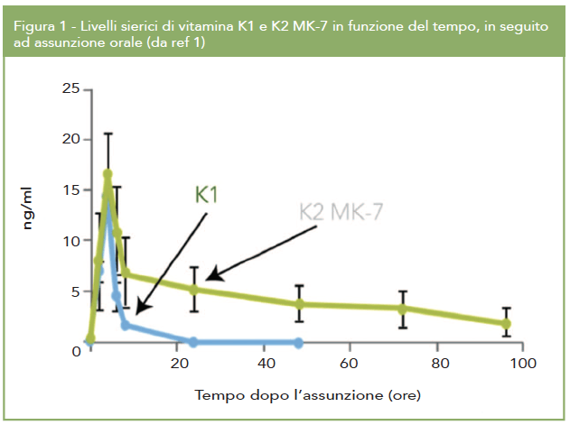 MK-7 è costituito da sette unità isoprenoidi e per questo motivo risulta essere caratterizzato da una maggiore lipofilia rispetto alla vitamina K1 e a MK-4, con conseguente maggiore assorbimento, distribuzione e biodisponibilità. Infatti, mentre queste ultime hanno una emivita ridotta, di circa 1-2 ore, MK-7 ha una emivita decisamente più elevata, di circa 2-3 giorni (Fig.1) (1).