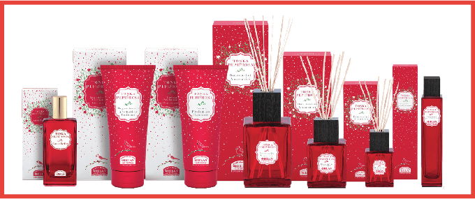 Da Helan è stata realizzata una linea per uso personale, Tonka & Pepe rosa, alla quale è stata affiancata un’extension dedicata alla casa: entrambe massimamente curate nei dettagli e caratterizzate da una sofisticata ricerca di elevata qualità in ogni componente. I due preziosi ingredienti, che danno il nome alle linee, ricreano l’atmosfera invernale, sprigionando, una volta amalgamati, un’avvolgente scia che stimola uno stato mentale di benessere e gradevolezza. Il profumo gourmand della Fava tonka (Dipteris odorata), con le sue calde note che ricordano la Vaniglia e il caramello, collegate a quelle speziate di Cannella e Mandorla su un fondo erbaceo di fieno appena tagliato, sprigiona un aroma intenso e penetrante. Il Pepe rosa (Shinus molle) si ricava da un albero originario dell’America latina che produce piccole bacche sferiche di colore rosa-rosso leggermente piccanti. Per distillazione, si ottiene un olio essenziale fragrante, aromatico, simile a quello del pepe nero, ma più dolce e delicato. La linea, per uso personale, comprende, oltre ad un’Eau de Parfum, un Bagnodoccia Aromatico Tonificante che può essere utilizzato per corpo e capelli, e una Crema Profumata Rigenerante per il corpo. La formula del bagnodoccia racchiude estratti di Ginkgo biloba e Tè verde per un’azione anti-fatica e proteine di Mandorle dolci per un’efficace azione sostantivante. La crema, oltre agli ingredienti appena menzionati, si avvale dell’azione idratante e nutriente di oli di Cotone e Riso, nonché di vitamine C ed E come validi antiossidanti.